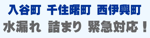 入谷町 千住曙町 西伊興町での水の困った即解決!急な水道トラブルに緊急でかけつけ訪問し、蛇口の水漏れ、トイレ詰まり、排水の溢れ、タンクの故障など修理いたします。